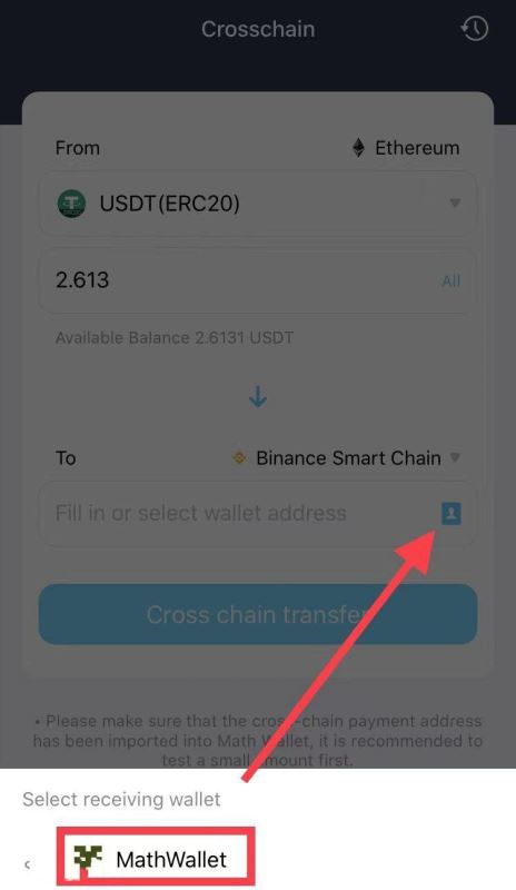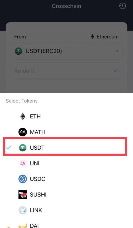 2.进入跨链页面,选择转账资产,目前支持:ETH/USDT/MATH/UNI/USDC/SUSHI/LINK/DAI