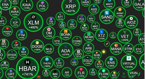 Cryptobubbles 数据显示,Hedera (HBAR) **在过去一个月上涨了 763% 以上,成为 11 月份 100 种**加密货币中表现**的**。
