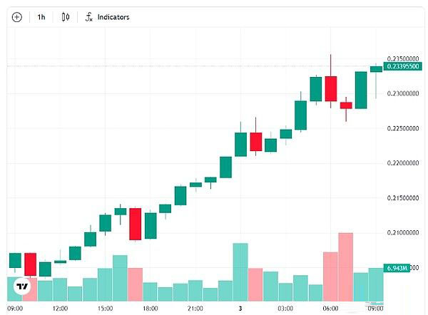 数据显示,截至UTC时间12月3日上午10点20分,Tron的价格在24小时内上涨了13%以上,创下了0.23美元的历史新高。