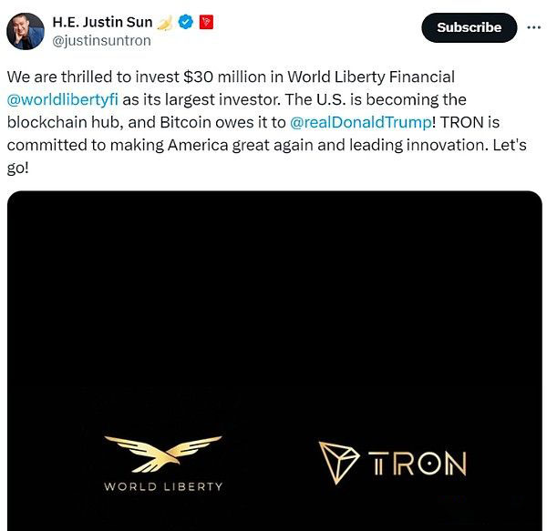 TRX创下历史新高之前,Tron创始人Justin Sun透露,在11月25日向WLFI**投资3000万美元后,他已成为唐纳德·特 朗普加密项目的**投资者。