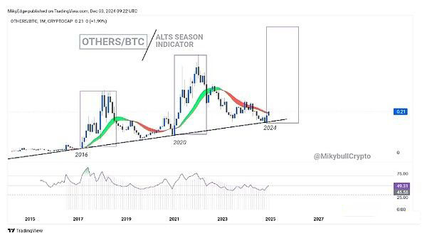 交易员Mikybull Crypto在12月3日的一篇文章中表示,根据山寨币相对于比特币市值的下降比例出现的历史模式,12月的山寨币反弹已经开始:
