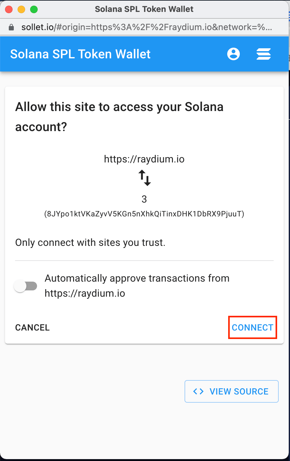 输入完后会要求你确认跟Raydium 连接,按下「CONNECT」。