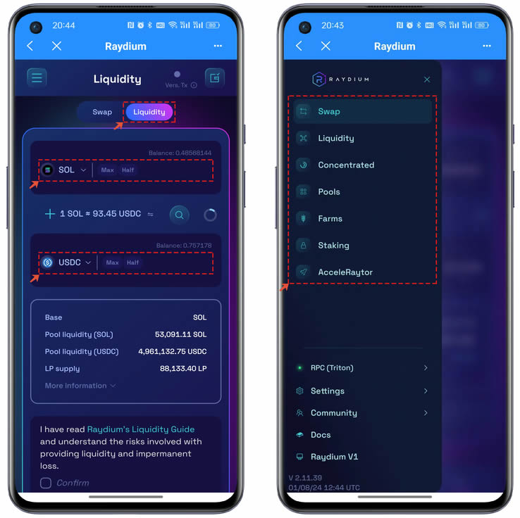 4、Swap功能旁边还有Liquidity,同样也是非常熟悉的功能和界面,只需要把想加入流动性的2个**种类和数量设置好之后就可以执行存入并得到LP凭证。界面左上角的菜单集成显示了Raydium所有的功能,也都是日常的一些DeFi功能,您可以根据自己的喜好和使用习惯来选择。