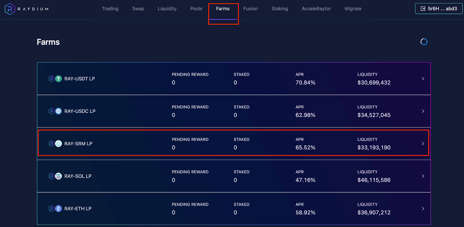 到Farm 的页面找到RAY-SRM LP 并把它点开。
