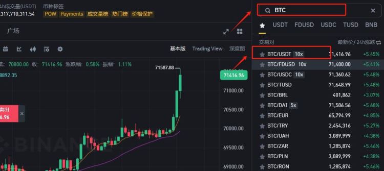 8、搜索币种简称【BTC】,选择【BTC/USDT】交易对