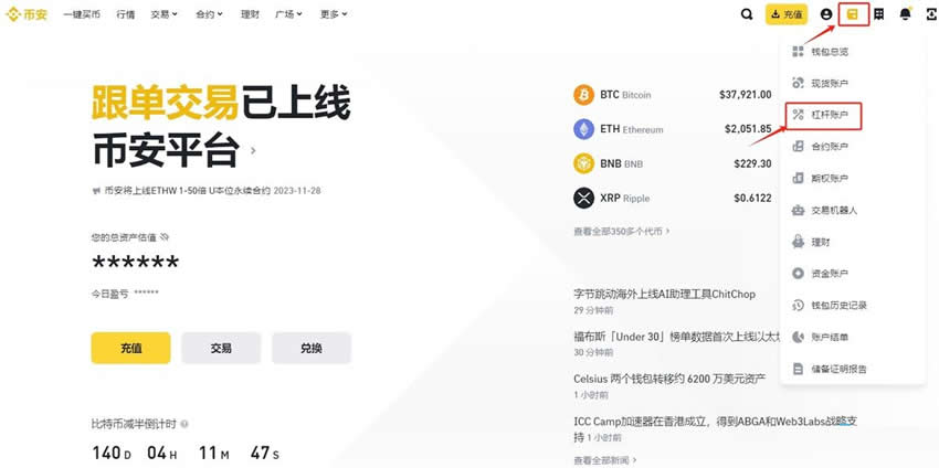 1、登录币安账户后(点此注册),在首页找到“钱包”图标,选择“杠杆账户”