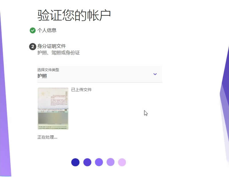 7、选择身证证明文件有护照,身份证和驾照都可以,并上传照片
