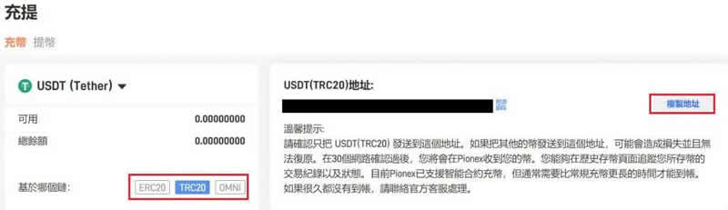 步骤二:进入充币页面后,你需要选择以上说的三种主网以及入金的货币。这边示范USDT(Tether),使用TRC20 这个链入金。