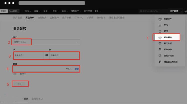 1、进入欧易官网(点击注册),点击【资产管理】,选择想要划转的币种,填写数量-【确认】,将所需进行交易的数字资产从【资金账户】划转到【交易账户】