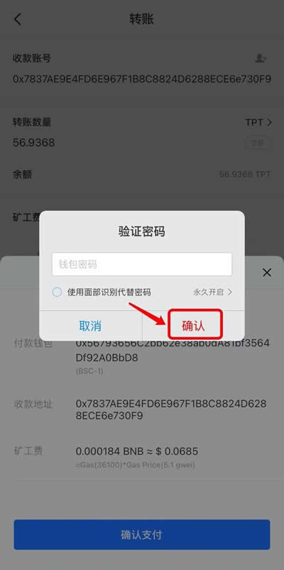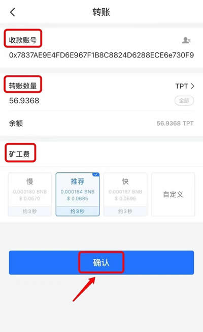 4、依次填入【收款账号】和【转账数量】,选择矿工费,然后点击【确认】;