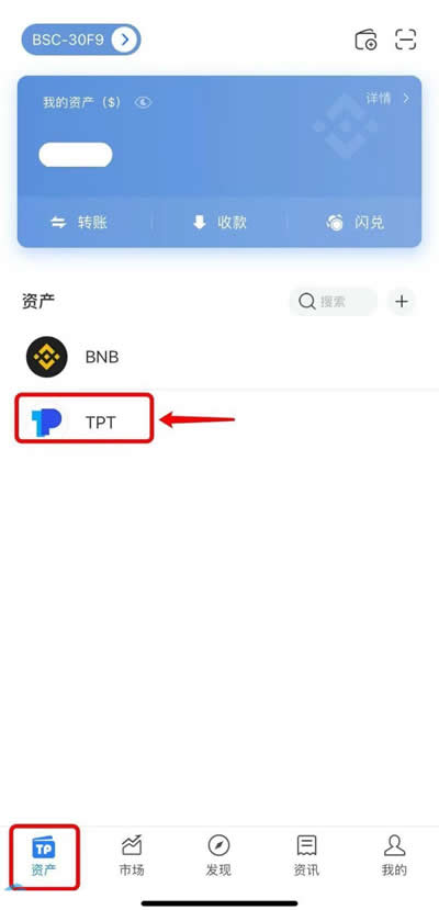 1、打开TokenPocket,在【资产】页面选择需要提现的**;(此处以提现BSC链的TPT为例)