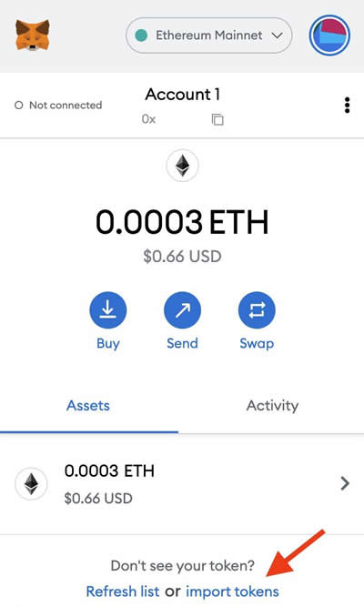 1.点击钱包主页“资产”选项卡底部的“导入**”。