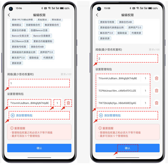 阈值、管理地址、权重要认真检查合理设置,一旦完成上链后是不可逆的操作;