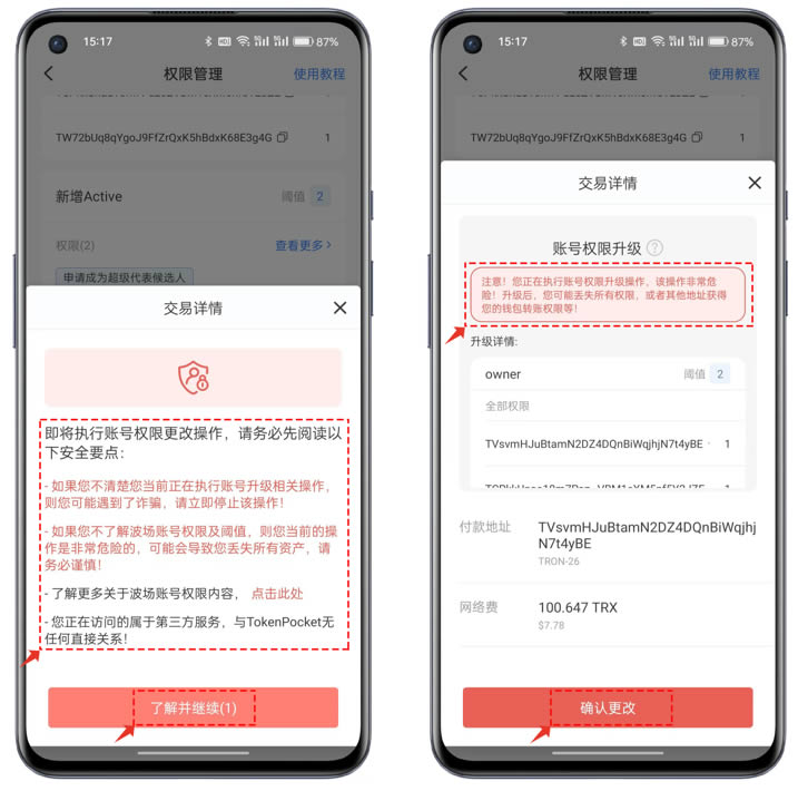 3、确认好owner和active等参数都设置完毕后,点击底部的【确定升级权限】会弹出安全要点提示,**要检查自己设置的阈值、权重、管理地址是否正确和合理,点击【了解并继续】后来到了**的交易详情的执行界面,在这里依然可以在【升级详情】中确认执行的内容是否完整和正确,核对后点击【确定更改】并支付Gas(网络费)后就可以完成波场地址的权限变更操作。