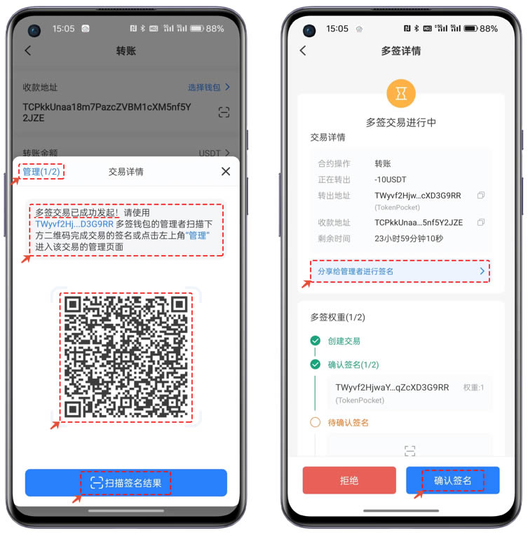 4、使用其中一个地址完成签名后,可以看到新弹出的界面中展示的动态二维码,此时,可以选择另一台管理地址的TokenPocket钱包进行扫码签名。或者可以点击左上角的【管理】菜单,在详情界面中点击【确认签名】。