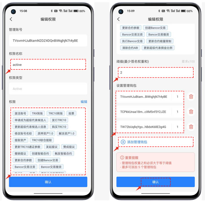 同样的active也可以直接替换权限地址(单签)也可以设置多个管理钱包(多签名),设置合理的阈值和管理地址及权重能更安全更灵活的管理资产。设置好active的参数后即可点击底部的【确认】保存参数。