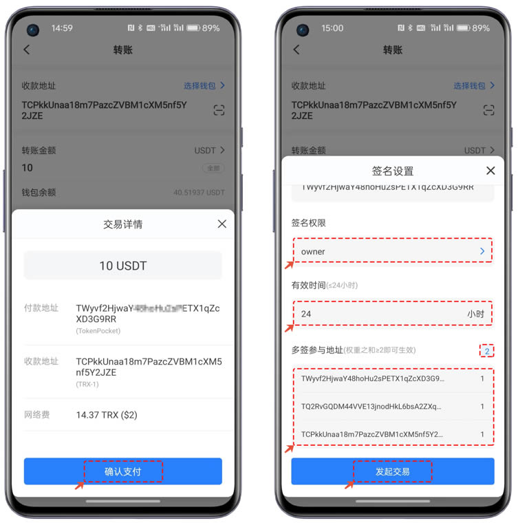2、交易详情中点击【确认支付】后弹出【签名设置】窗口,这里可以看到【签名权限】、【有效时间】、【参与地址】等信息。其中签名权限可选owner或active权限,有效时间需要设置大于等于24小时,参与地址会展示当前多签钱包的owner或active的管理地址,2代表了执行上链的阈值,地址后的1代表了管理地址的权重。