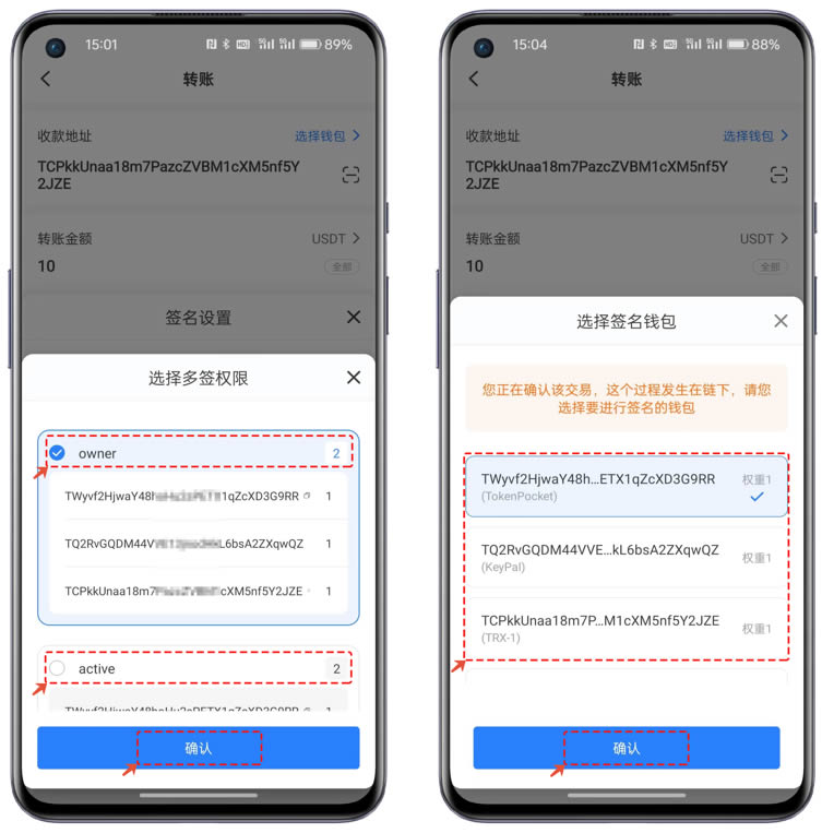 3、选择owner或active时根据自己的实际情况,2个权限均可执行转账操作,具体的要根据多签设置时具体分配的权限执行内容为准。