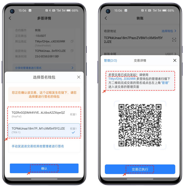 选择多签权限并点击【发起交易】后,根据弹出的地址来选择签名钱包。