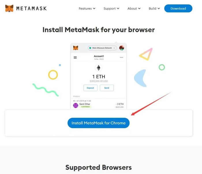然后我们用Google Chrome打开MetaMask,我们就可以看到MetaMask客户端下载的主页,因为没有中文,大家可以通过翻译软件解决。