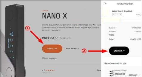 我们以Ledger Nano X为例,点击下方橙色的“添加到购物车”按钮,添加成功后会在右侧弹出提示,显示了购买数量和价格等信息,核对无误后点黑色的“结账”按钮。
