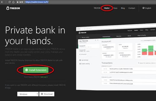 2. 使用chrome浏览器(版本号大于50)访问https://trezor.io/,并进入“wallet(钱包)”选项卡按照网页提示安装插件(**可能需要翻墙才能正常安装)