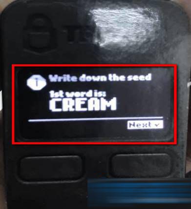 7.页面提示“Recovery seed setup”,此时用户的trezor设备会依次连续出现24个英文单词(作为备份信息),请将它们手写在备份记录卡上。这些信息将用于数据恢复,请用户务必妥善保管,同时尽量不要将这些信息上传到网上。