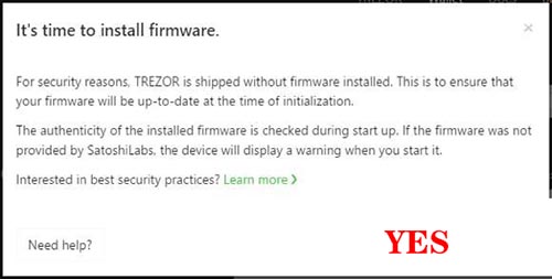 3.插件安装完之后网页会询问用户是否安装固件,此时会提示“it time to install firmware"的消息框,选择"Yes, install",这时trezor会提示“Install new firmware?”,选择“continue”之后trezor便开始过更新固件。(可能会需要等待一点时间)