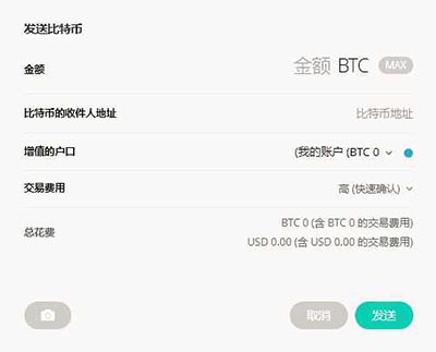 2. 发送,用于发送比特币或完成比特币付款。点击“发送”按钮弹出“发送比特币”窗口。