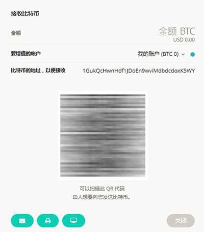 • 也可以通过右下角的三个按钮(如下图)分别将收款地址(字符串和二维码)通过邮箱发送、打印和本地保存。