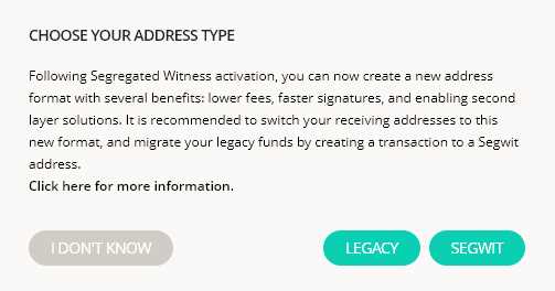 • 这里的"LEGACY"和"SEGWIT"分别对应比特币(BTC)的两种账户,可以直接选择任意一种或者直接选择“I DON`T KNOW”,这个步骤可以在“设置”中反复选择, 不用担心选错;