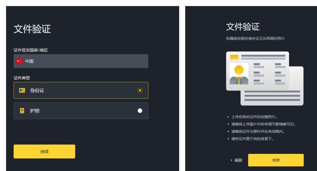5、在这里,您可以看到相应的验证类型:证件签发**/地区、拍摄政府颁发身份证正反两面的照片。不同**或地区的限额各不相同。点击【证件签发**/地区】的按钮,可以选择您的居住国或地区。