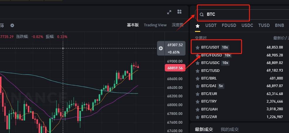 7、搜索币种简称【BTC】,选择【BTC/USDT】交易对
