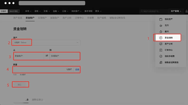 1、进入欧易官网(点击注册),点击【资产管理】,选择想要划转的币种,填写数量-【确认】,将所需进行交易的数字资产从【资金账户】划转到【交易账户】