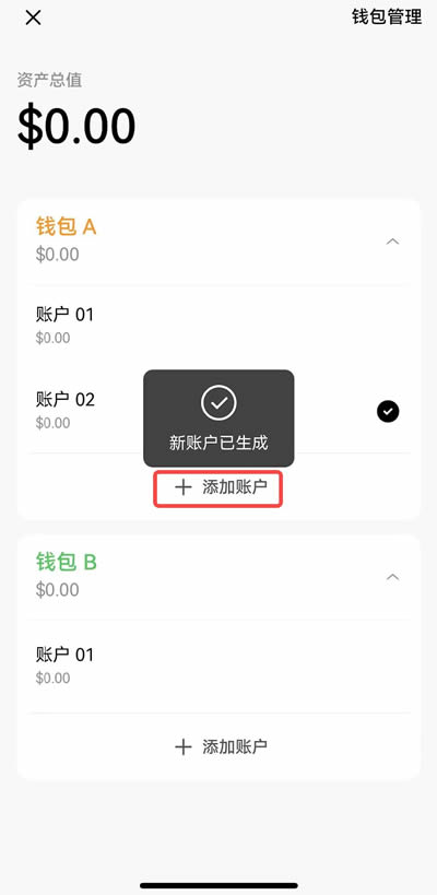 当你成功在欧易Web3创建钱包或用助记词导入钱包,就会自动生成一个账户,例如钱包A-账户01。如果你还想创建一个新账户,点击【▼】,选择想添加账户的钱包,例如钱包A,然后点击【 添加账户】,即完成新账户创建。钱包A下属的这些账户共享一套助记词,通常被称为是派生钱包。