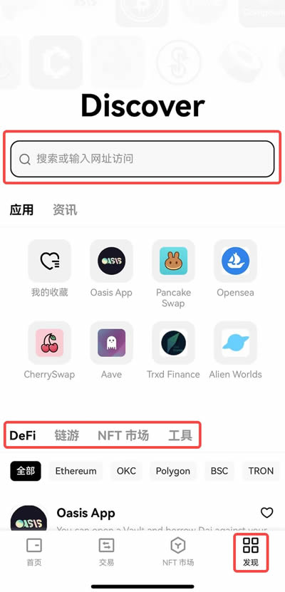 以App为例,用户可在搜索框或DeFi、链游、NFT市场、工具四大排行榜中基于链筛选并查看各式Dapp,点击即可跳转。如需使用某一Dapp,连接钱包即可使用。也可以将**使用的Dapp点击【】添加至【我的收藏】,方便查找。