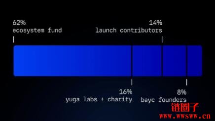 ApeCoin 的总供应量为10 亿枚。其中,62% 空投给Bored Ape Yacht Club (BAYC) NFT 持有者,16% 分配给Yuga Labs 和慈善机构,14% 分配给Launch 贡献者。剩下的8%分配给BAYC创始人。