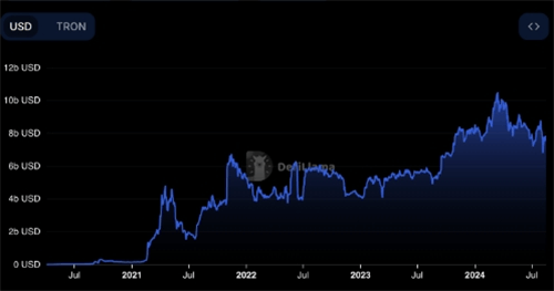 然而,在光鲜亮丽的成绩背后,Tron也面临着一些挑战。DefiLlama的数据显示,尽管TRX**价格在2024年6月实现了9.5%的显著上涨,但Tron的总锁定价值(TVL)却在同期降至约76亿美元的六个月低点。尽管7月份有所回升至约87亿美元,但8月份又回落至约76亿美元附近,显示出市场对其价值的波动态度。