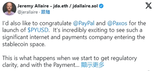 而 Circle 的执行长 Jeremy Allaire 也消息发出不久后发推恭喜 PayPal 和 Paxos,并认为这是监管越来越明确的表现。