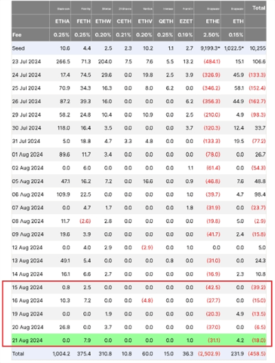 在这段时期内,尽管部分日期如8月12日未报告净流量变化,但ETHE几乎每日都在经历资金撤出。特别值得注意的是,从8月15日至21日的五天里,以太坊ETF领域总计流失了9220万美元的资金,进一步加剧了市场的担忧情绪。