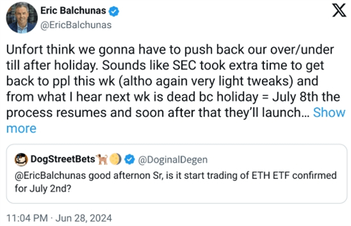 SEC对S-1表格进行了细致的审查,并提出了反馈意见,要求发行人在7月8日之前根据这些意见重新提交表格。Balchunas表示,这一新的时间表意味着以太坊现货ETF的推出可能会推迟到7月中下旬。