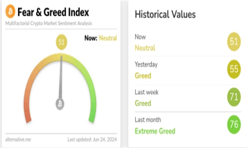 市场数据显示,比特币价格在6月23日触及七周低点,达到59,086美元,受多种因素影响,市场情绪受到**影响。其中包括Mt. Gox计划出售其价值85亿美元的比特币资产,以及近期比特币交易所交易基金的大量资金流出。加密货币市场的恐惧与贪婪指数也随之下滑至“中性”区域。
