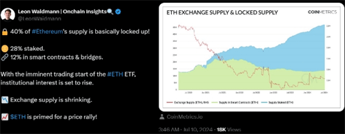 Bitwise**投资官Matt Hougan预测,以太坊现货ETF在上市后的前18个月内可能吸引高达150亿美元的资金流入。即便这一预测值减半,分析师也认为以太币价格将受益于大量被锁定在质押和去**化应用程序(DApp)中的供应。据Onchain分析师Leon Waidmann指出,以太币目前约有40%的供应被锁定,同时交易所的以太币存款在过去一个月内从1334万枚减少至1221万枚,这表明市场抛售压力有所减轻。