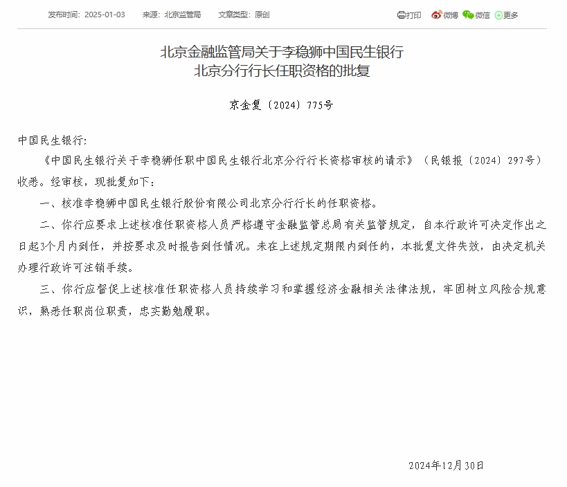 民生银行北京分行行长李稳狮任职资格获批 作者:LR •更新时间:2025-01-06 11:16:56•阅读 0 财经1月6日讯 近日,北京金融监管局公布批复显示,核准李稳狮**民生银行股份有限公司北京分行行长的任职**。
