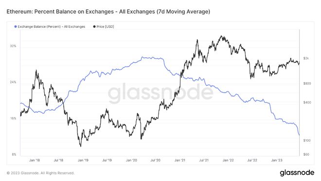 根据Glassnode数据,当前交易所中持有的ETH 余额在过去30 天中急剧下降至12.6% 创下新低。而通常交易所供应量的减少被视为看涨的信号,因为这意味着能出售的ETH 数量减少。