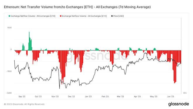 上一次出现如此大量ETH 从交易所撤离的时间点,约发生在2022 年11 月左右,当时ETH 的价格在震荡一段时间后,价格迅速在今年1 月上涨了超过33%。