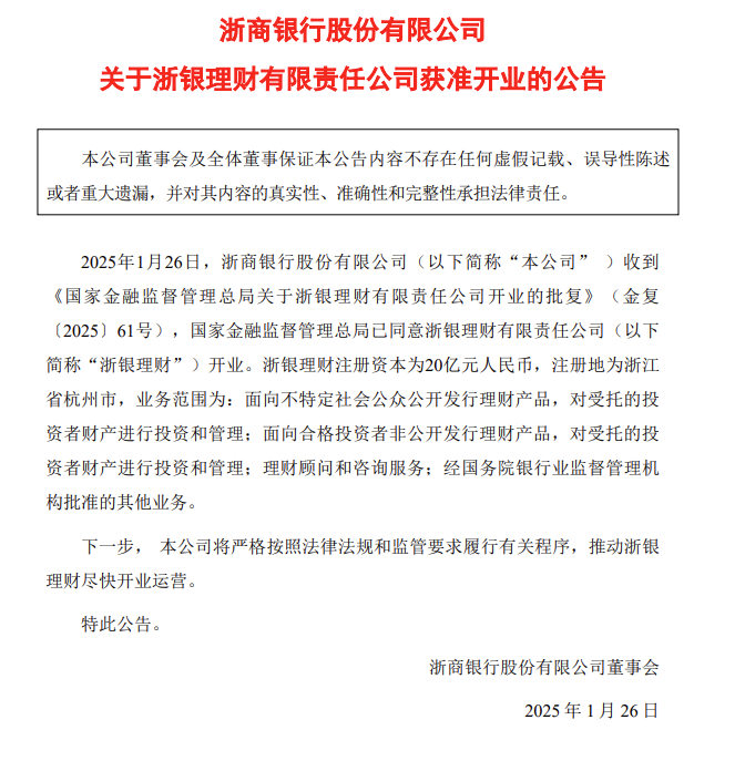 财经1月26日讯 今日,浙商银行发布公告,2025年1月26日,浙商银行收到《**金融监督管理总局关于浙银理财有限责任公司开业的批复》(金复〔2025〕61号,**金融监督管理总局已同意浙银理财有限责任公司(以下简称“浙银理财”开业。浙银理财注册资本为20亿元人民币,注册地为浙江省杭州市。