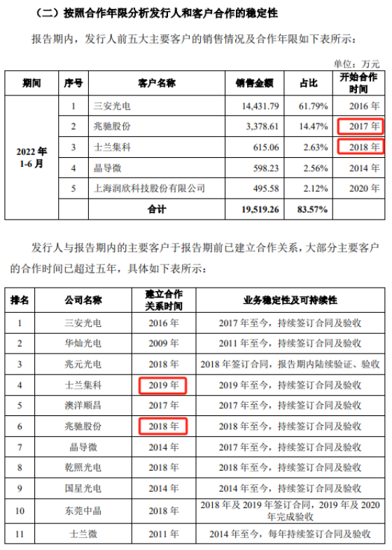 招股书显示,矽电股份与三安光电、兆驰股份合作时间均超过了五年,分别于2015年、2017年开展商务接触,并分别于2016年9月和2017年7月**发送样机开展验证工作。但在合作开始时间上,矽电股份在回复问询中的表述存在不同,三安光电的合作开始时间均为2016年,但兆驰股份的开始合作时间出现了2017年和2018年2个版本。另一客户士兰集科的开始合作时间也出现2018年和2019年2个版本。