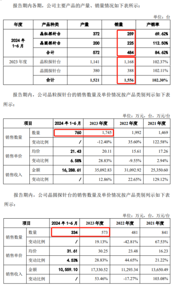 在业绩下滑的同时,矽电股份的产品销量数据也出现下滑。据其招股书注册稿,公司2024年前6个月销售晶粒探针台259台,晶圆探针台225台,产销率为84.62%,不足2023年的1/3。在2023年,公司售出晶粒探针台1168台、晶圆探针台388台,产销率102.3%。