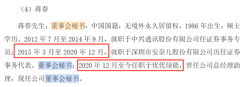 此外,财经记者发现,优优绿能董事会秘书蒋春在公司的任职起始时间(2020年12月,与其在A股上市公司安奈儿(002875.SZ的离任时间(2021年7月存在7个月重叠期。这种关键岗位的时间"双簧"现象,还给优优绿能的信披质量蒙上一层阴影。